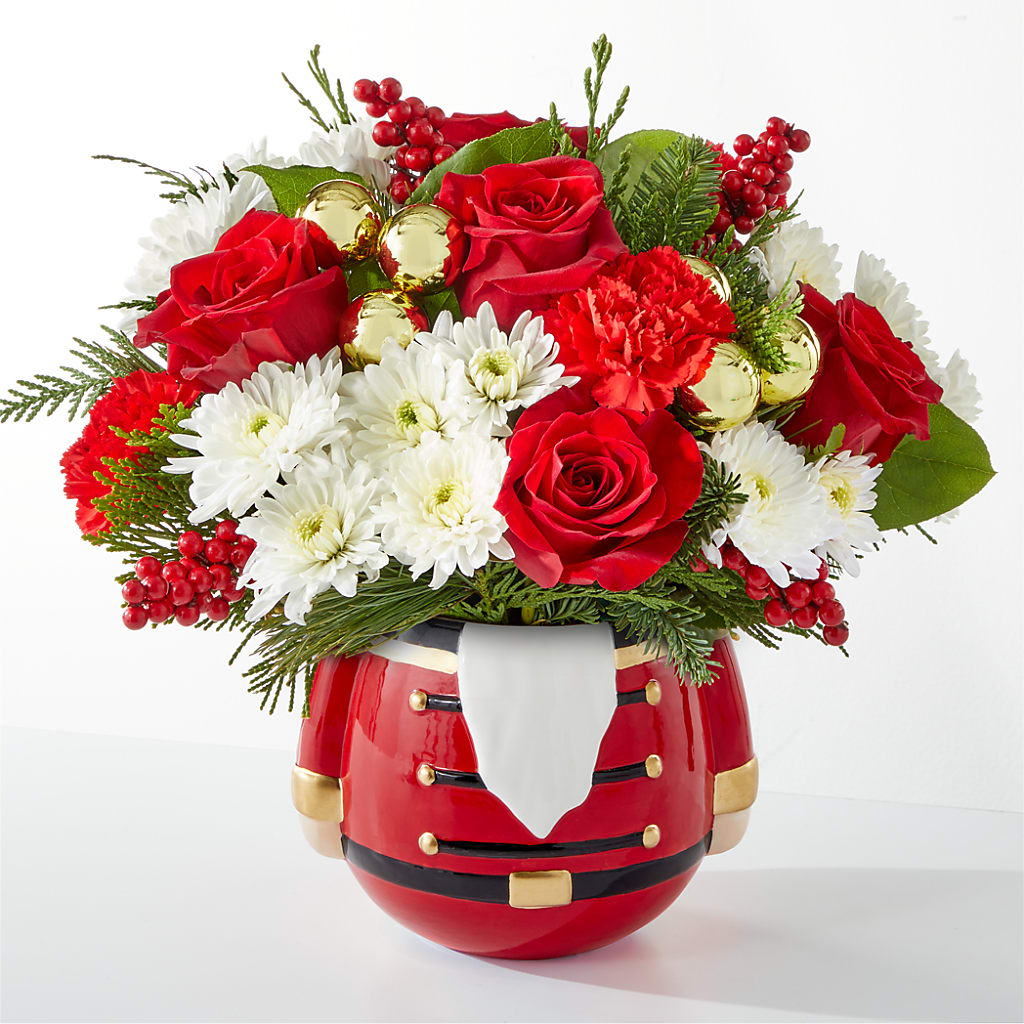 Share in the nostalgia of the season with a collectable nutcracker vase perfectly accented with holiday blooms.
